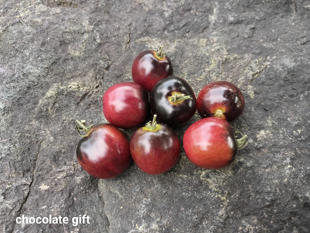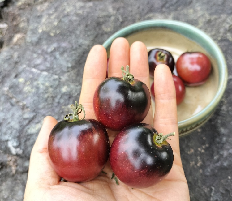 見た目がまるでアメリカンチェリーにそっくりなトマト、ショルダーが黒、深紅のようなボルドー色が渋くてとってもおしゃれ、たくさん実ってくれます。チェリートマトの大きさです。