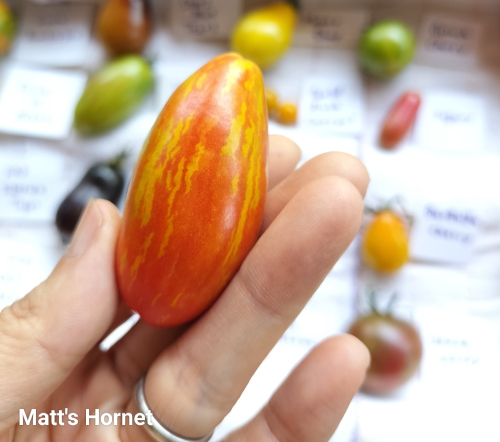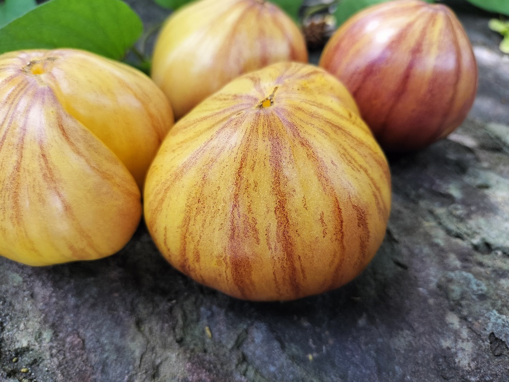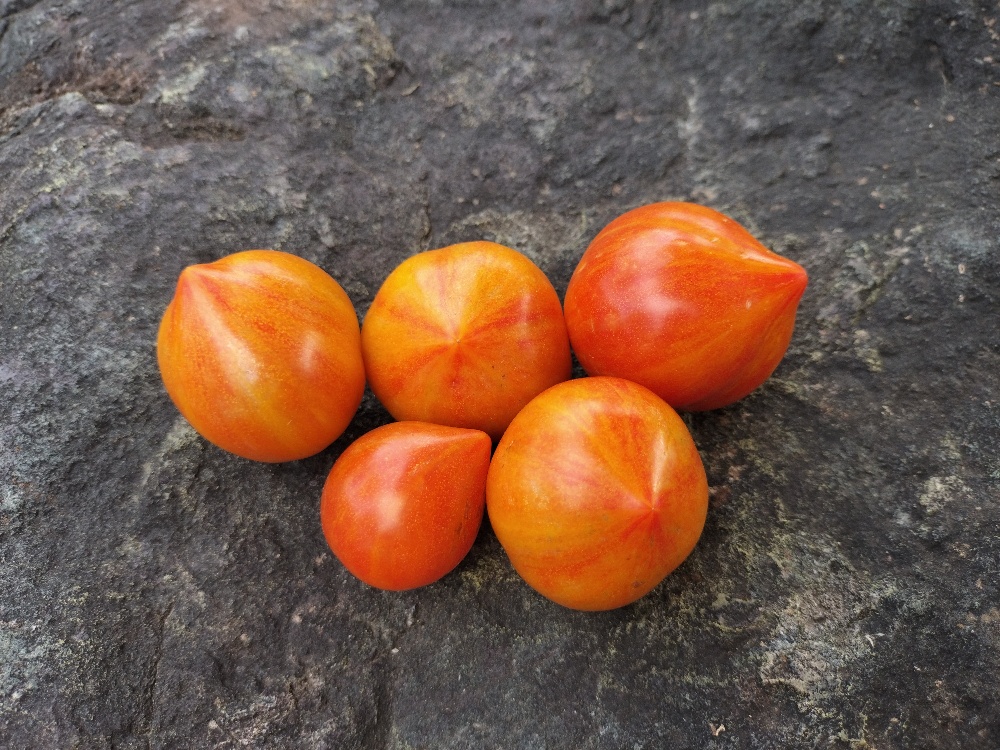 ヨーロッパで人気。中玉位のサイズ。レッドにイエロー〜オレンジのゼブラ模様が目を引きます。とっても美しいので育てる過程もとても楽しめます。生でも美味しいですが、トマトソースなどの加熱調理もおすすめ。