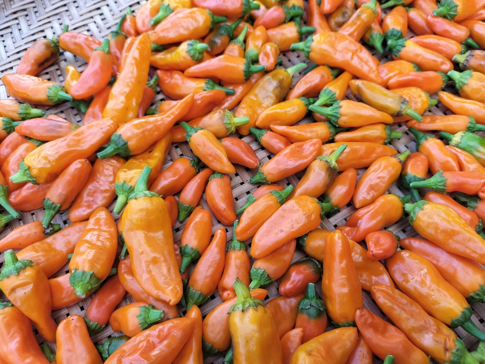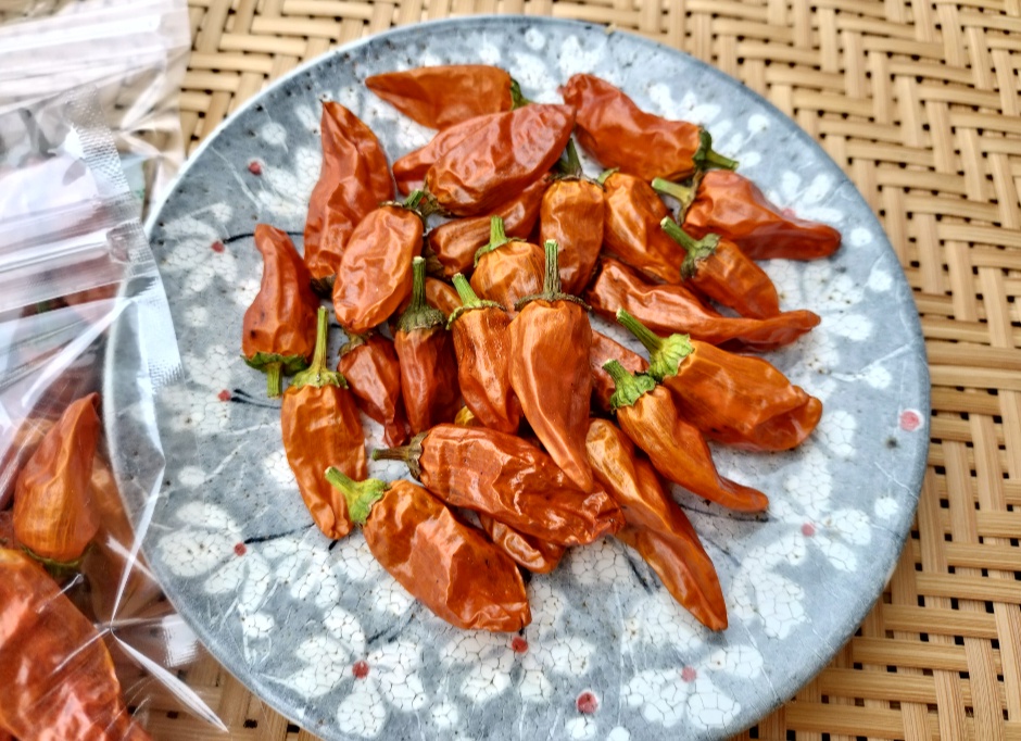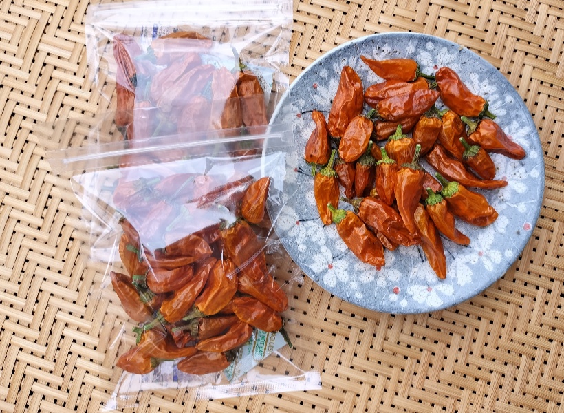 とてもきれいなオレンジ色の唐辛子に出来上がりました。鷹の爪の2倍の辛さで、とても辛味の強い唐辛子です。